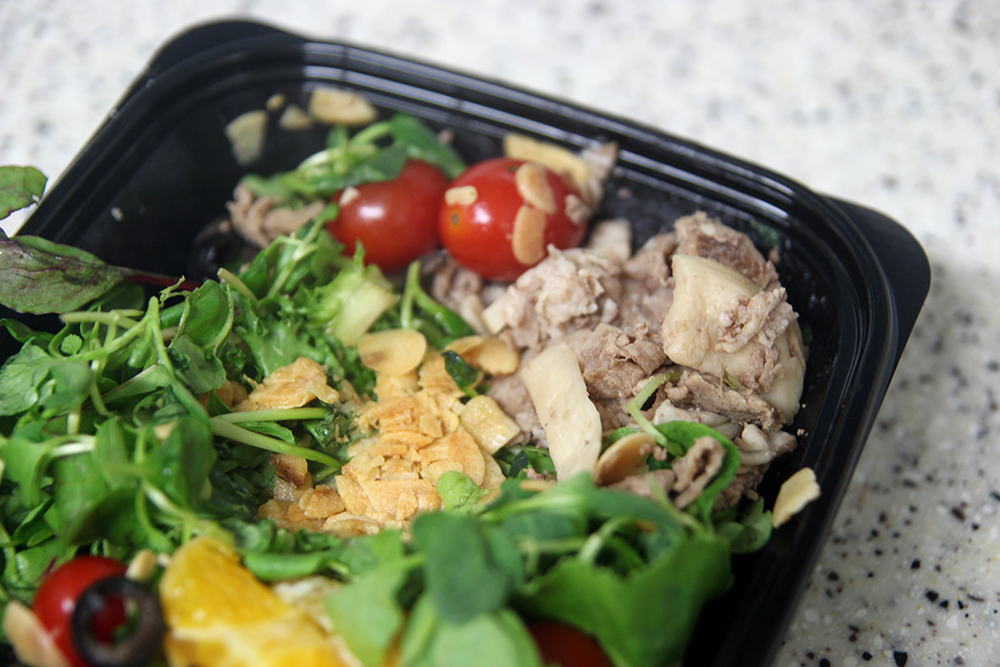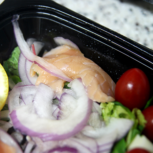 자, 그럼 우선, 도시락샐러드 하나씩 보여드릴께요! 우서 조이풀이라는 미스터 훈제연어 풀샐러드!