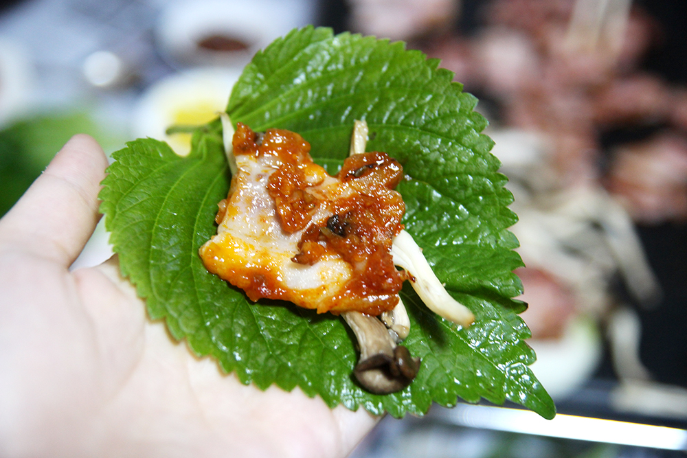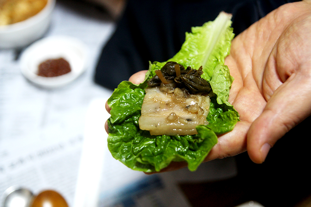 그냥 마늘보쌈인 경우에는 이렇게 상추 쌈에 싸먹으면 딱 맛있는 느낌! 위에 깻잎장아찌 까지 얹어 드시는데, 요렇게 먹는게 제일 맛있다고 하시더라구요! 상추와 함께 싸먹어도 맛있고, 그냥 마늘보쌈만 먹어도 맛있어요!