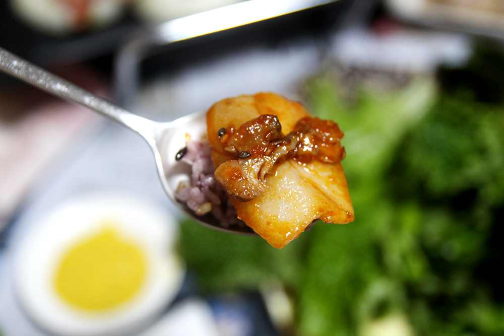 요렇게! 숭이네는 잡곡밥이라서 흰쌀밥은 아니지만, 아무튼 얹어먹으니 맛있었어요. 비계랑 살코기 비율도 적합했구요. 사실 살코기만 있으면.. 흠 뭔가 식감이 아쉽거든요. 살짝 퍽퍽한 느낌도 없지않아 있구요. 하지만! 비계와 살코기의 비율이 적절해서 씹는 식감도 좋아고! 맛도 좋았어요! 앙 개꿀맛 ㅎㅎ