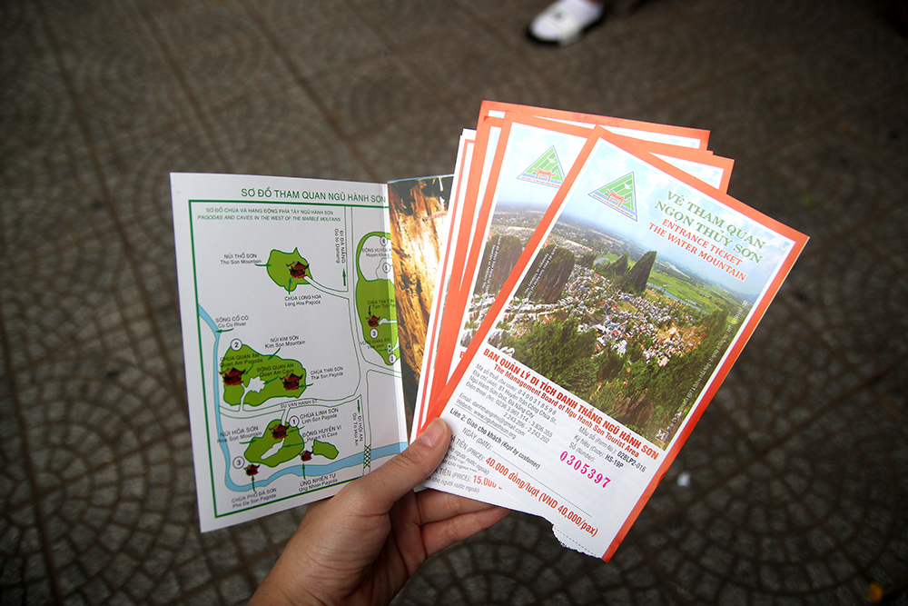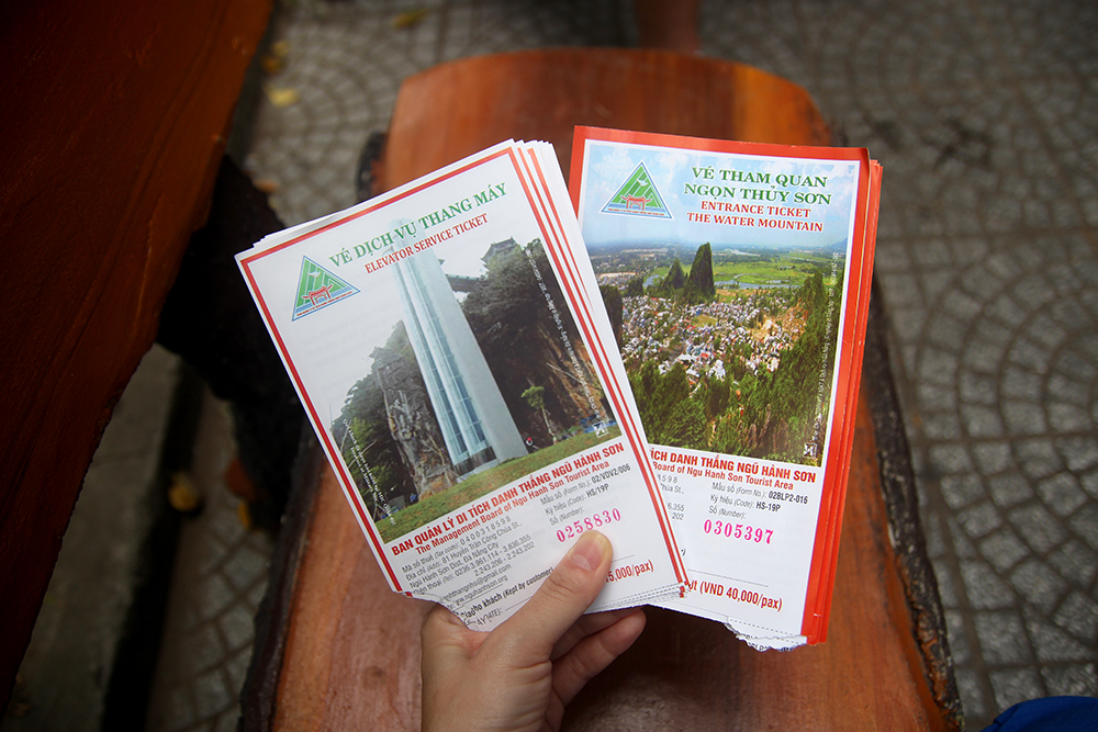 여기가 표 끊는 곳이에요! 오행산 관람권을 끊을 수 있고, 엘리베이터 사용권을 끊을 수 있어요. 엘리베이터 이용료는 15,000동! 한국 돈으로 1500원 이에요. 왕복이니까 1인당 3,000원이라고 생각하시면 됩니다! 아 그리고 들어가는 입장료는 40,000동이에요! 우리나라 돈으로 2,000원인셈이죠.