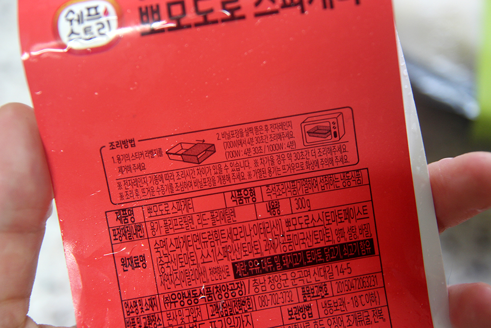 즉석조리식품 조리방법이 뒷쪽에 기록되어 있는데요. 용기의 스티커 라벨지를 제거해 주시고, 비닐 포장을 아주 사알짝 끝부분을 뜯어 주신 후, 전자레인지에서 4분 30초간 데워주시면 돼요. 700W의 경우 4분 30초! 1000W일 경우 4분 돌려주시면 된답니다.