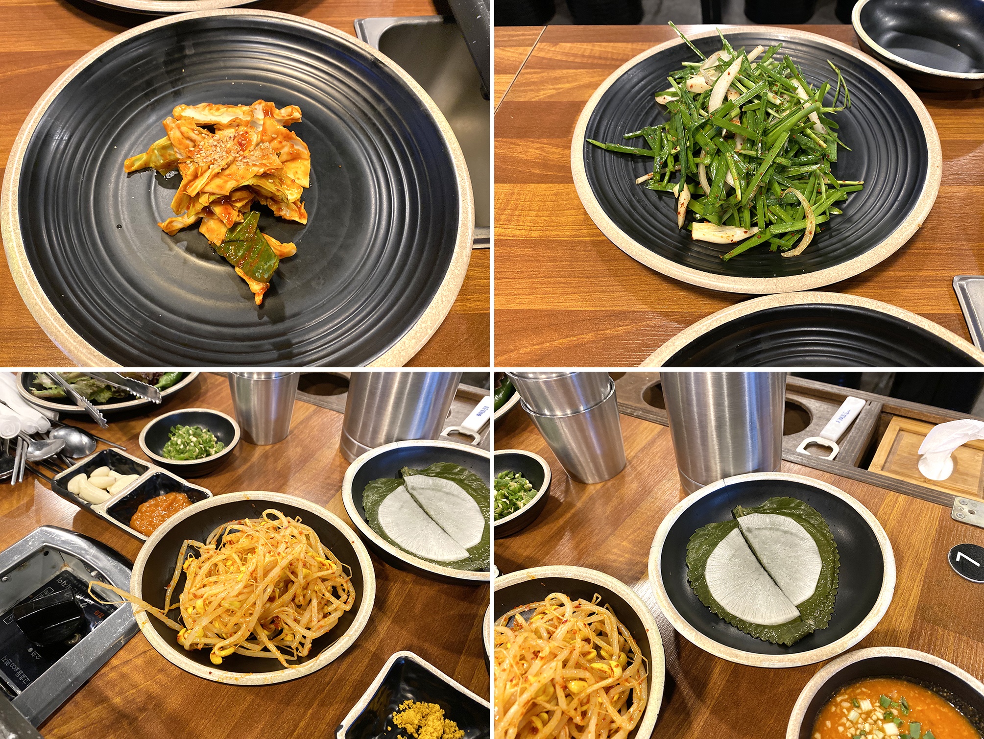 기본으로 나오는 찬들이에요. 고기와 함께 어울려 먹기 좋은 아이들로 구성되어 있는데요. 개인적으로 콩나물 무침과 깻잎+쌈무 조합은 완벽합니다. 콩나물무침은 고기 구워 먹을 때 같이 구워 먹구요. 깻잎+쌈무 같은 경우는 고기 먹을 때 상추 위에 매번 챙겨 올려 먹어요.