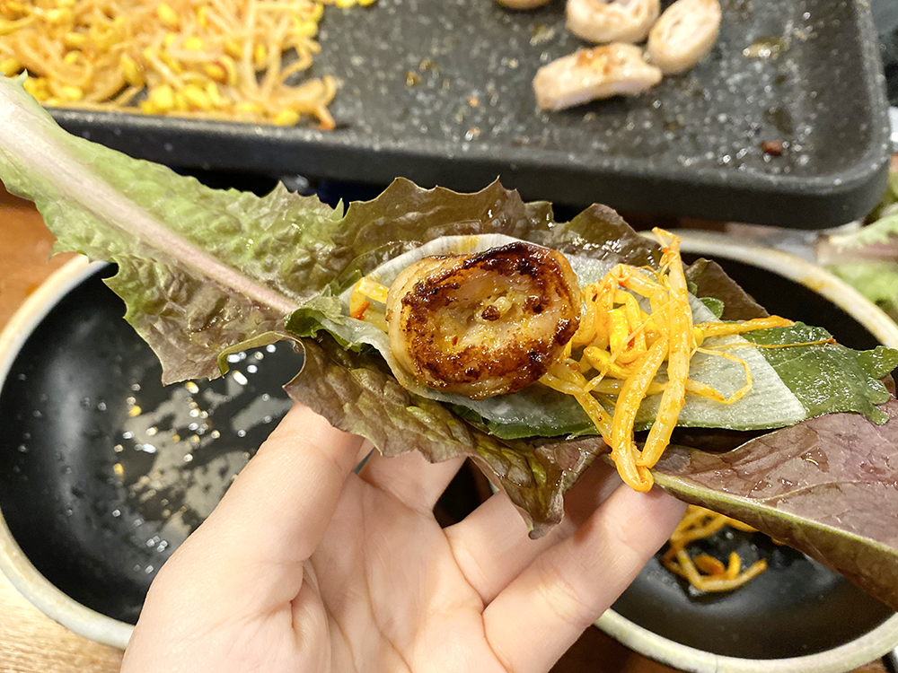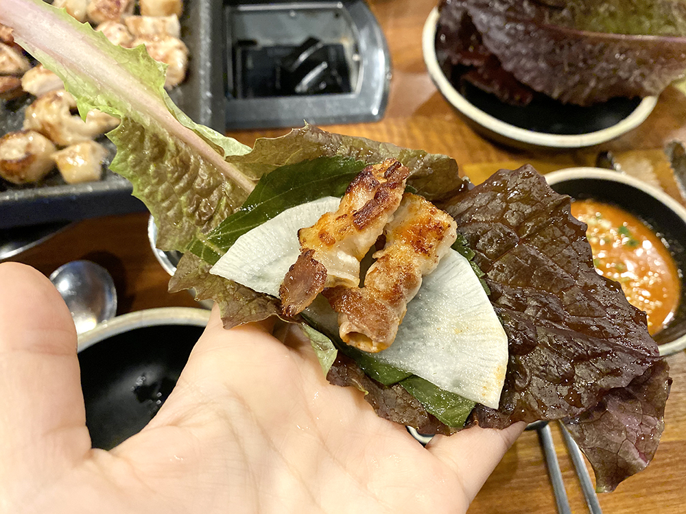 제가 제일 맛있게 먹는 방법이에요! 상추 위에 깻잎과 쌈무를 얹고! 잘 구워진 대패삼겹살 딱딱 얹어서 호로록 먹는 겁니다. 역시 고기는 쌈싸먹는게 제일 맛있다고~쌈무랑도 너무 잘 어울려요. 대패도 바삭하니 잘 구워져서 정신없이 먹었답니다!