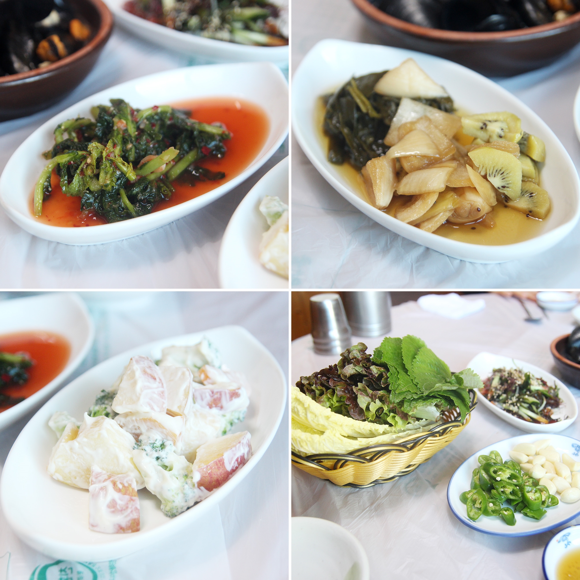 그 다음 찬들은, 물김치와 장아찌, 사라다, 쌈채소들이에요. 파파님께서 장아찌를 정말 맛있게 드셨는데요~ 키위로 장아찌를 만든건 처음봐서 신선하더라구요!! 물김치는 꼼장어 먹는 중간중간 입가심 하기 좋았어요.