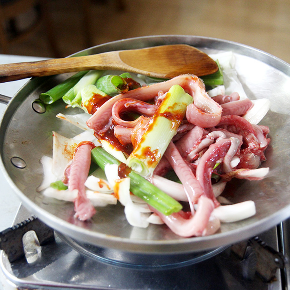 불 올리고 기다리면 요로코롬 서서히 익는답니다! 보글보글 끓기 시작할 때, 꼼장어 살에 양념이 잘 베일 수 있도록 살살 저어주면서 익혀주시면 돼요!