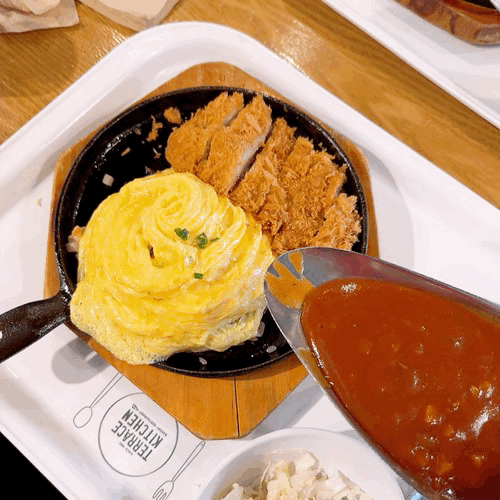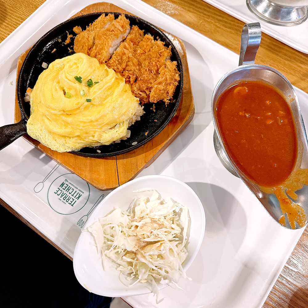 튀긴거 별로 안좋아하시는 분들은 테라스오므라이스 드시면 될 것 같은데요. 요기에 치킨까스가 추가된게 치킨까스 오므라이스기 때문에 가장 추천드리는 메뉴는 치킨까스 오므라이스 랍니다!