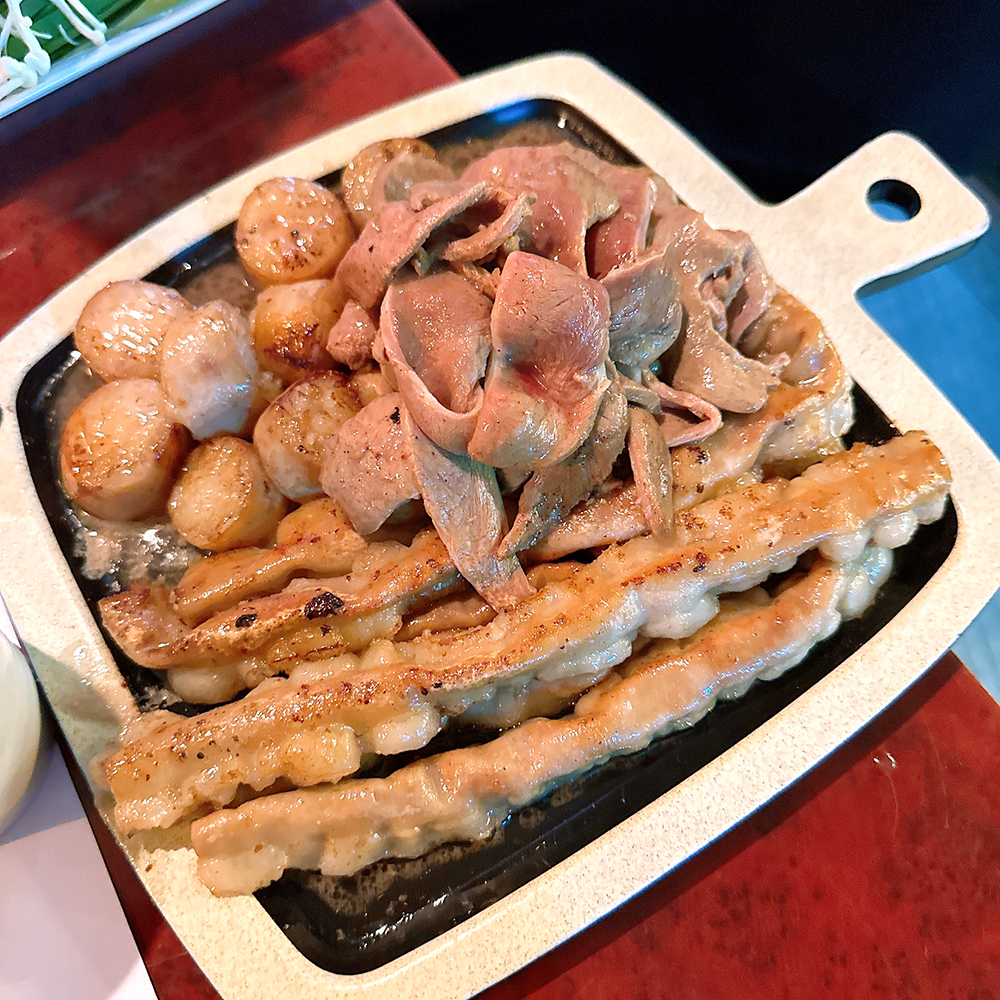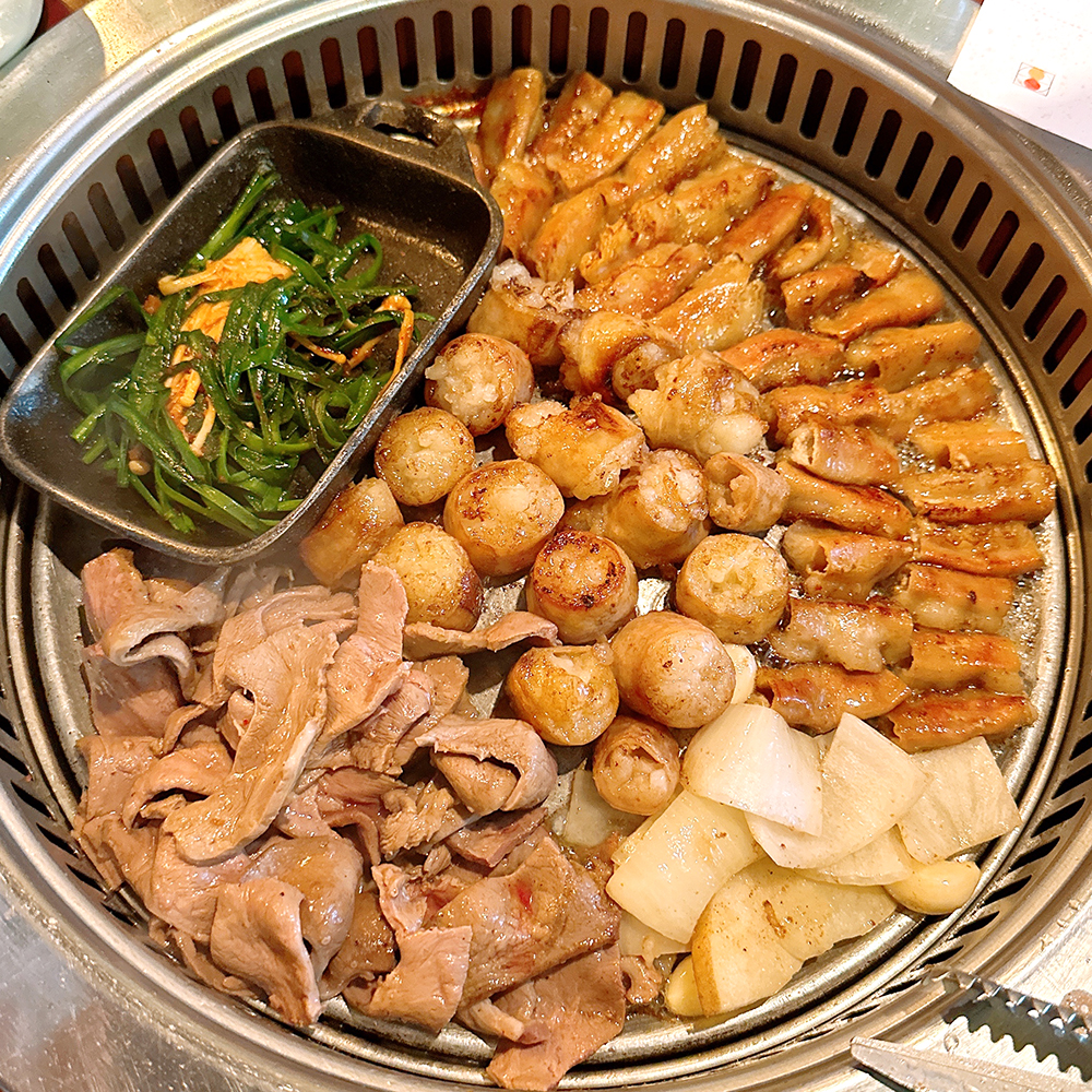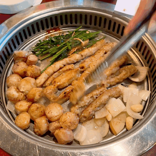 짜잔- 기다렸던 오늘의 주인공이 도착했어요! 곱창모듬구이 인데요- 곱창, 대창, 염통 그리고 구이야채로 구성되어 있답니다. 사실 뭐가 뭔지 구분 잘 못하지만, 일단 셋 다 맛있었어요. 특히나 저는 대창이 취향인걸로~ 대창이 저 커다란 동그라미 맞죠?!!