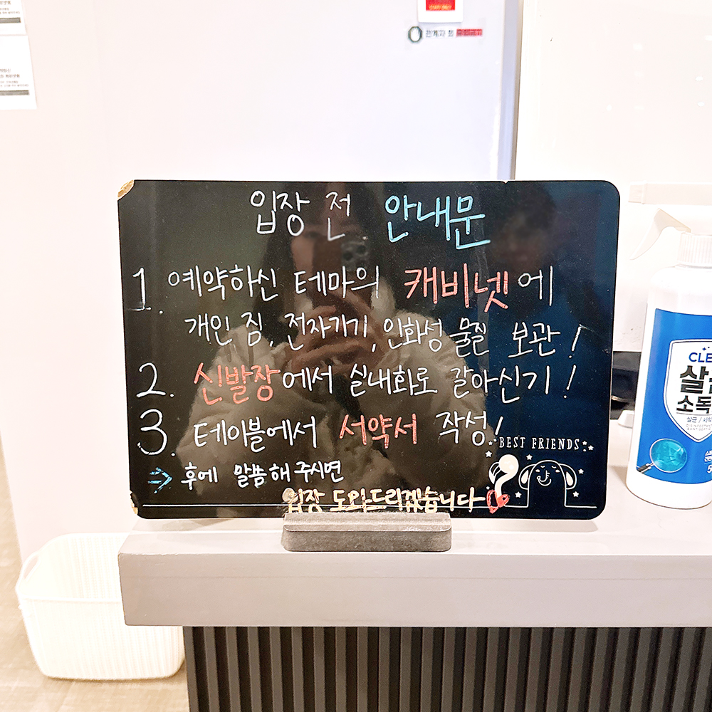 입장 전 안내문을 산뜻하게 읽어줄게요! 예약한 테마의 캐비넷이 따로 있기 때문에 거기에 가방이나 짐, 전자기기 모든걸 보관해주시면 됩니다.