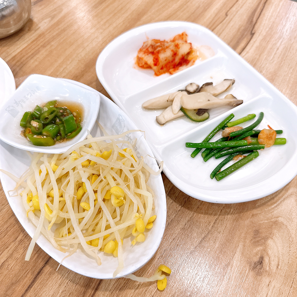 요건 기본으로 세팅되는 찬들입니다. 콩나물무침이랑 버섯, 김치, 그리고 미역국까지! 미역국은 셀프바에 없지만 다른 반찬들은 셀프바에 있기 때문에 부족하면 더 가져다 드시면 돼요.