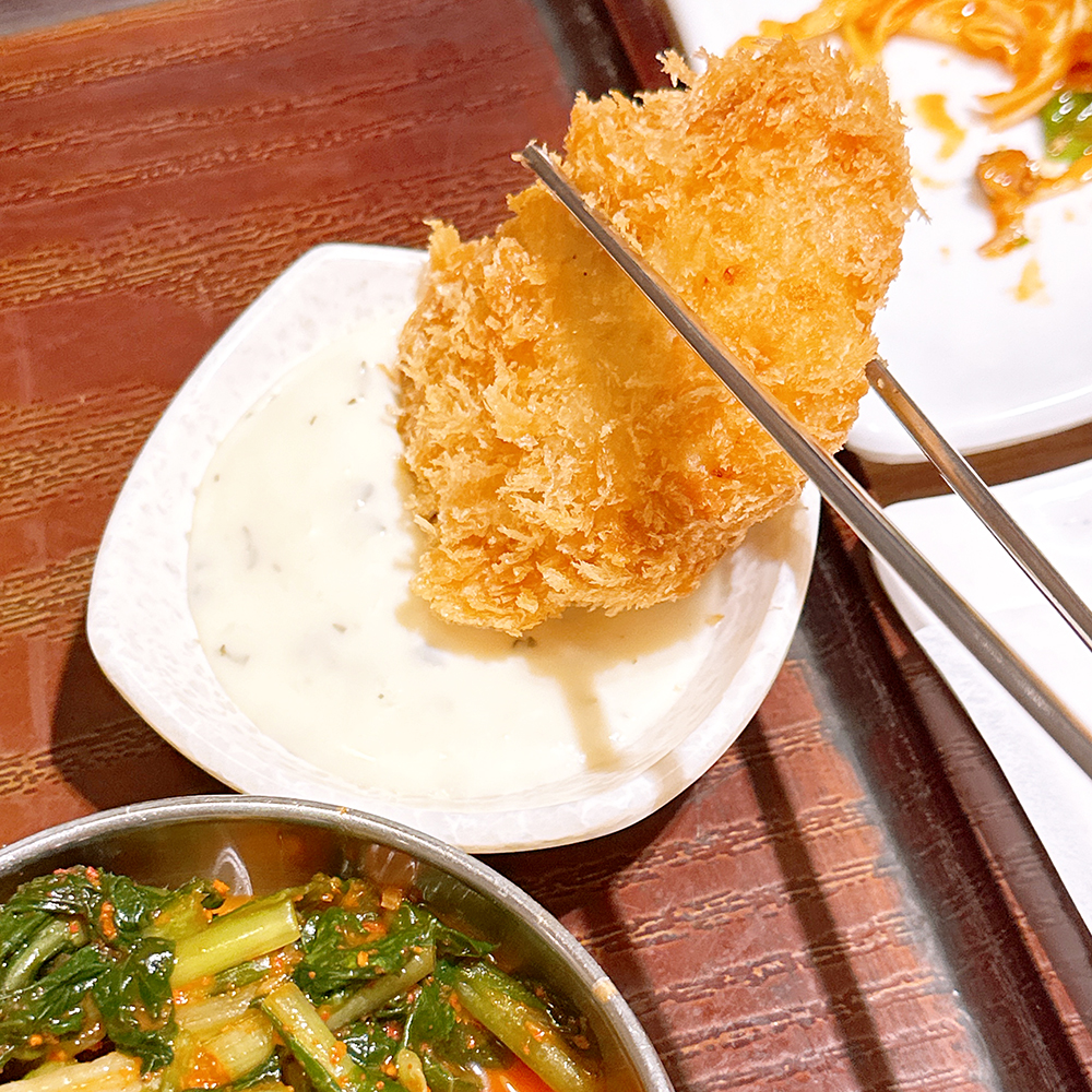 소스에 살짝 찍먹하면 더 맛깔나게 먹을 수 있는데요! 안쪽에 따뜻한 고구마 무스와 치즈가 믹스되어 있어서 입안에서 살살 녹아요. 물론 개인적으로 저는 울산 현대백화점 맛집 고복식당 가게되면 비빔밥 부터 먹을테지만- 고로케도 맛있게 먹었답니다.