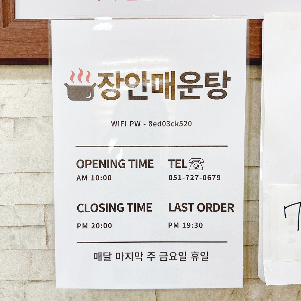이 곳 장안매운탕 영업시간은 오전 10시 부터 오후 8시까지 입니다. 라스트오더가 오후 7시 30분이니까 참고해주세요~