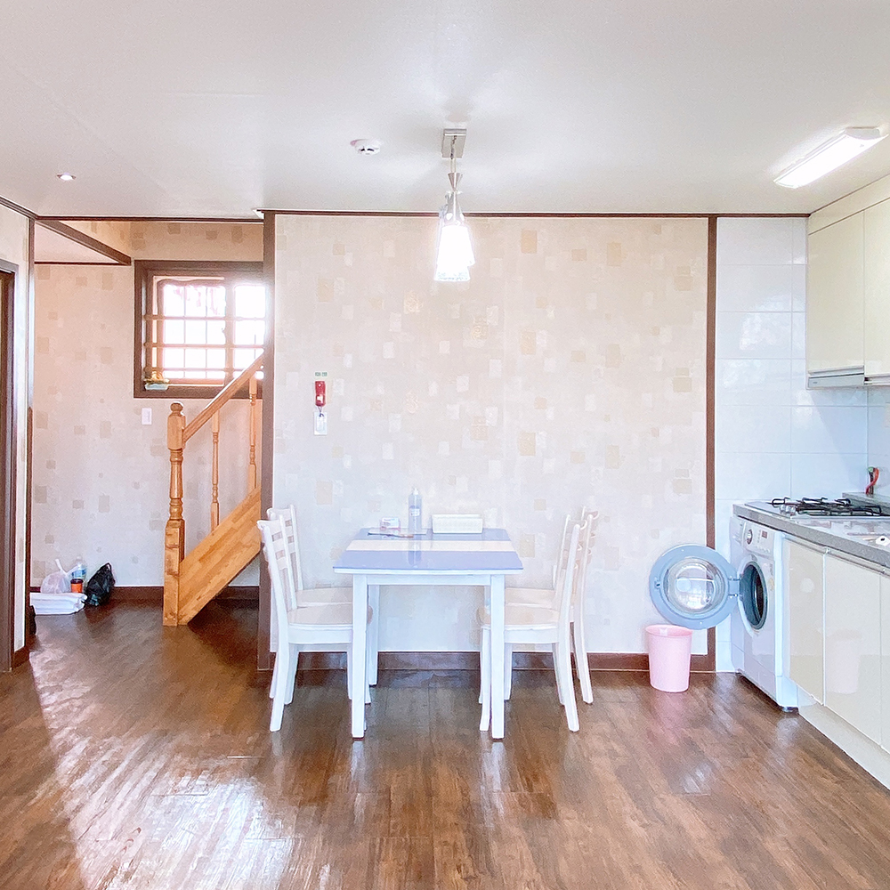 식탁과 주방- 막 엄청 화려하진 않지만, 필요한 건 모두 구성하고 있습니다. 심지어 세탁기까지 있으니까요!