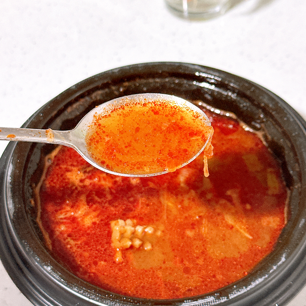뭔가 처음 딱 열었을 때의 비쥬얼은 "어..? 이게 뭐지...?" 싶었어요. 흠.. 짬뽕 국물과 비슷하게 생겼는데 기름이 둥둥 떠있어서 "어..?" 하고 망설여지더라구요. 짬뽕국물 같은 비쥬얼은 아니었어서.. 살짝 저렴한 느낌이 든다고 해야 할까요?!