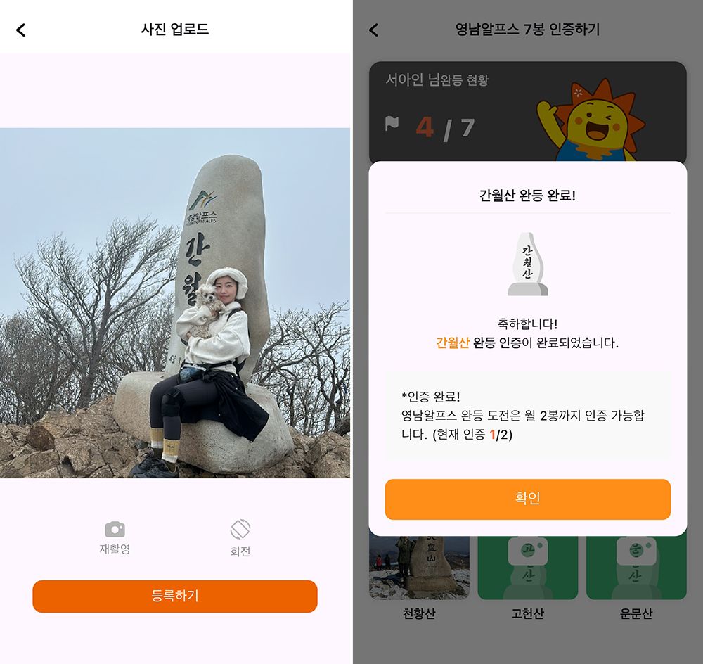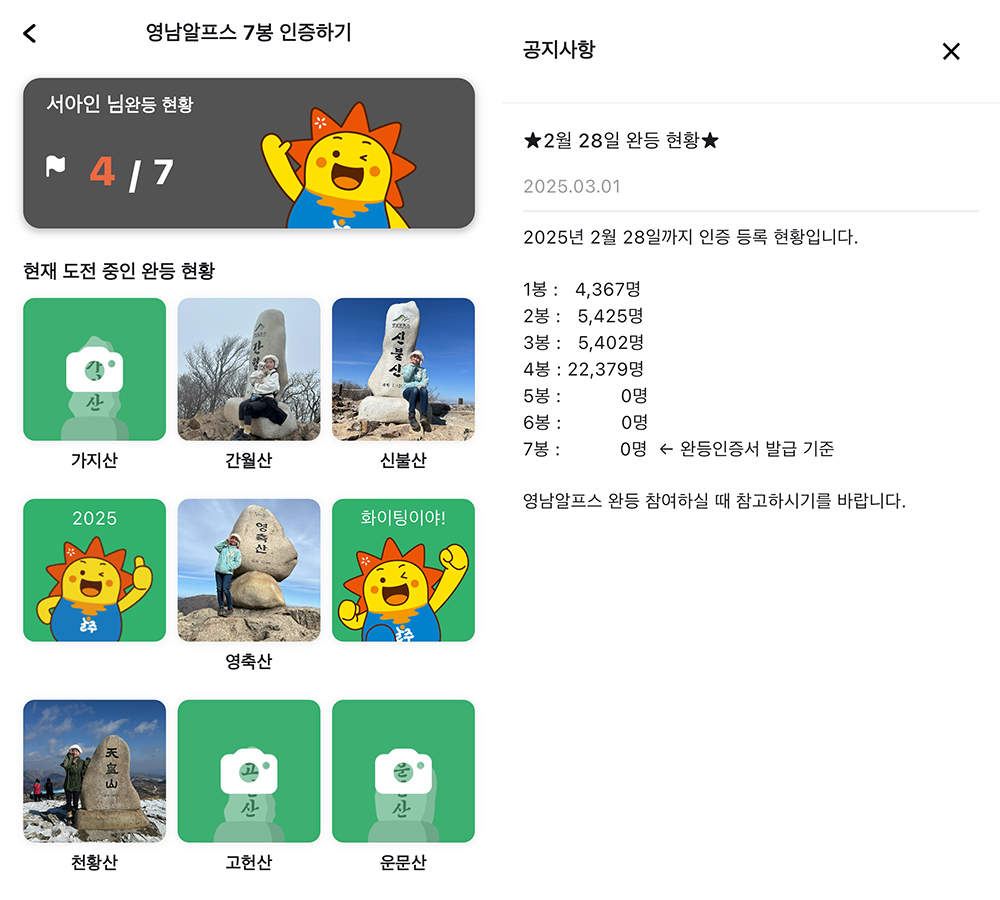 대기줄에서 열심히 기다린 결과, 짜잔! 2025 영남알프스 완등 인증 간월산 완료했습니다! 월 2봉까지 가능하기 때문에, 3월내 가지산을 탈지, 고헌산을 탈지 고민중이에요! 마마님과 함께 등산하기 때문에 가지-운문 연계산행은 조금 무리겠다 싶거든요.