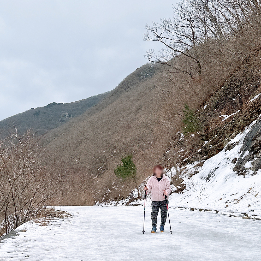 저희가 갔던 3월 1일이 많이 따뜻한 편이었는데- 그래도 음지는 아직 녹지 않아 이런 빙판길이 형성되어 있었어요. 아이젠을 필요로 하지는 않았었지만, 마마님께서 등산스틱이 있으니 확실히 걷기 편하셨다고 하셨습니다.