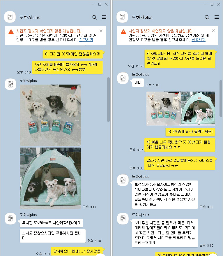 요게 보석십자수 주문 제작 당시 찡찡거렸던 저의 카톡입니다. 사진 못골라서 찡찡 거리고- 사이즈 못골라서 찡찡 거리고.. 결국 2가지 모두 시안으로 제작해서 보여주셨구요 :)