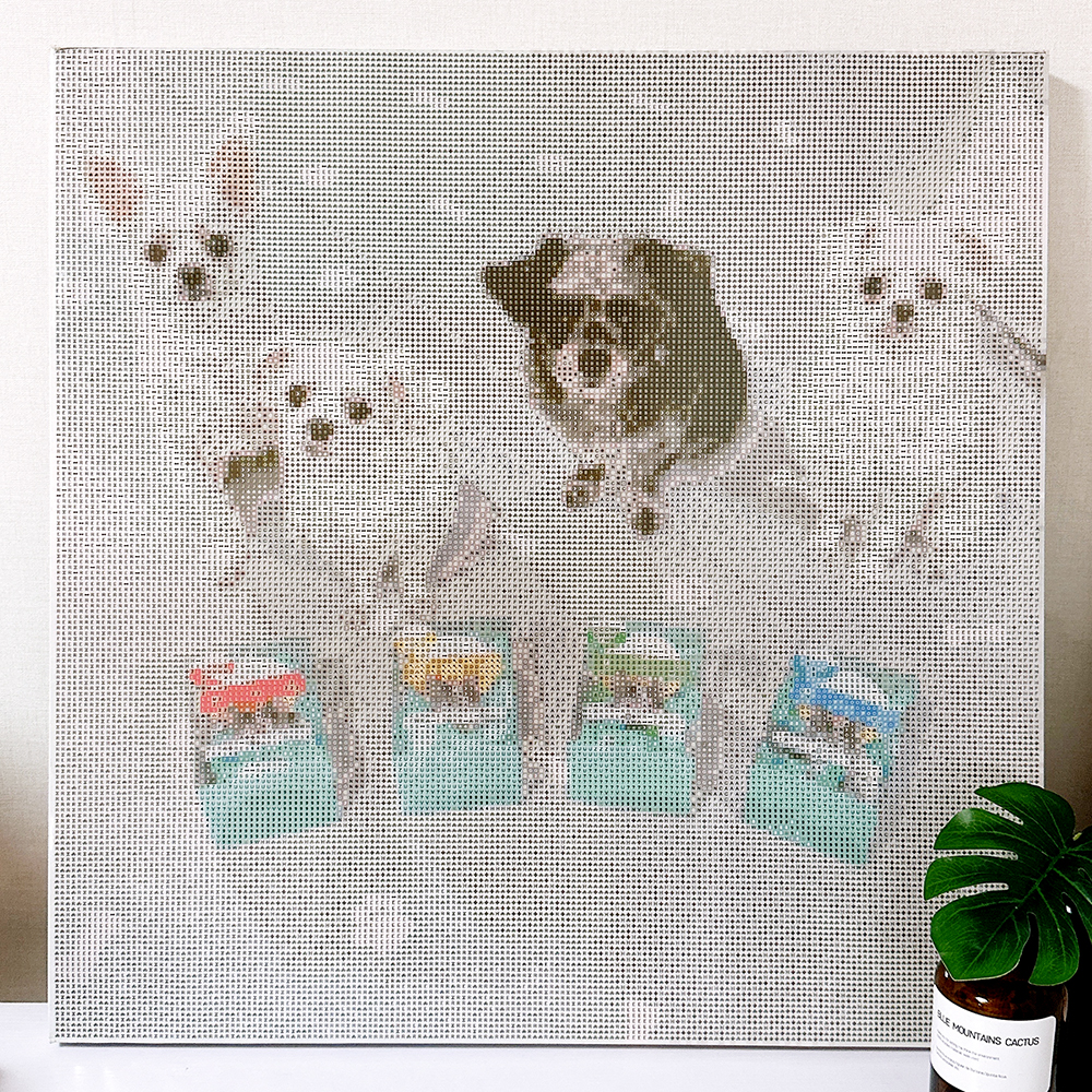 그리하여 도착한 저만의 보석십자수 주문 제작 상품! 보통은 해바라기나 디즈니 디자인으로도 많이 하던데~ 저는 이왕 할 거 저희 아가들을 해주고 싶었어요 :) 그래서 댕이들 4마리를 모두 담을 수 있는 사진으로 초이스.