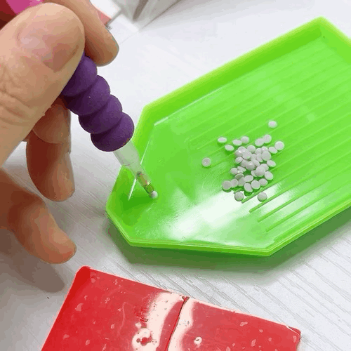 트레이에 부어둔 비즈를 위에서 콕! 찝으면 돼요. 그러면 저렇게 비즈펜이 잘 물고 있는 거 보이시죠?! 저대로 떨어뜨리지 않고 캔버스로 돌아온 다음-