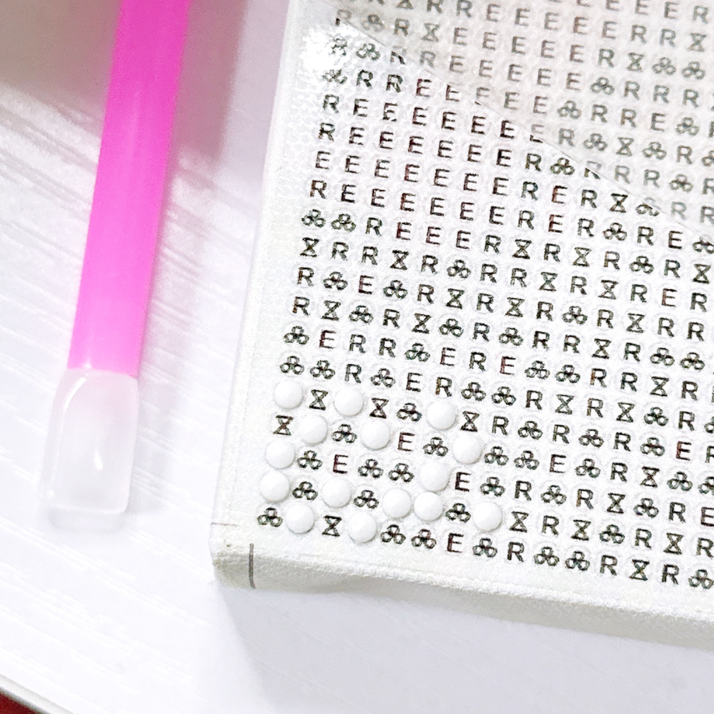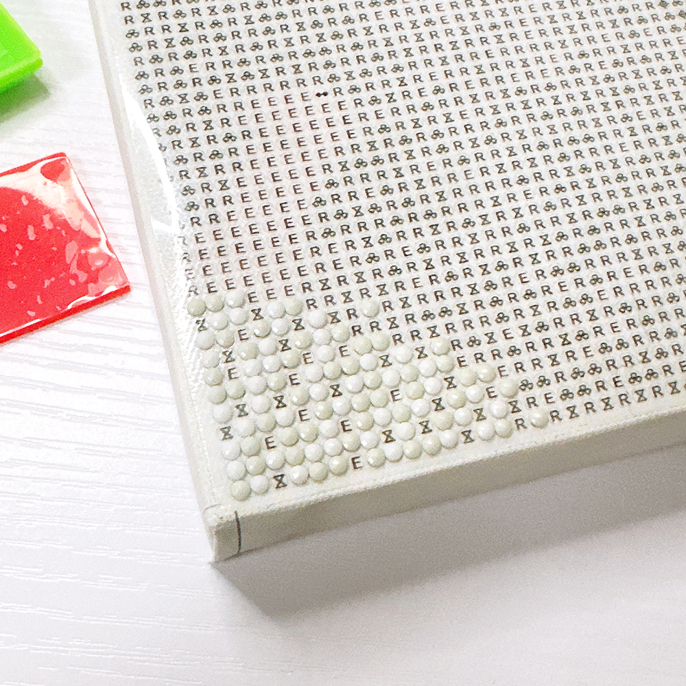 조심스레 비닐커버를 벗겨 주고 그 위치 그대로 콕! 찍어주시면 된답니다. 심볼과 비즈색상을 확인한 다음 같은 심볼 있는 부위에 죄다 붙여주시면 돼요! 진짜 넘나 재밌는 것! 이게 은근히 중독성 있다니까요?!