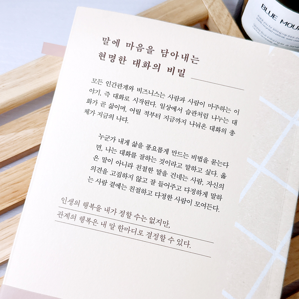 인생의 행복을 내가 정할 수는 없지만, 관계의 행복은 내 말 한마디로 경정할 수 있다. 라는 문구부터 시작해서 중간 중간 마음을 따쓰하게 만드는 글이나, 연습할 수 있는 용기를 주는 글들이 많아서 읽는 내내 정말 좋았습니다.