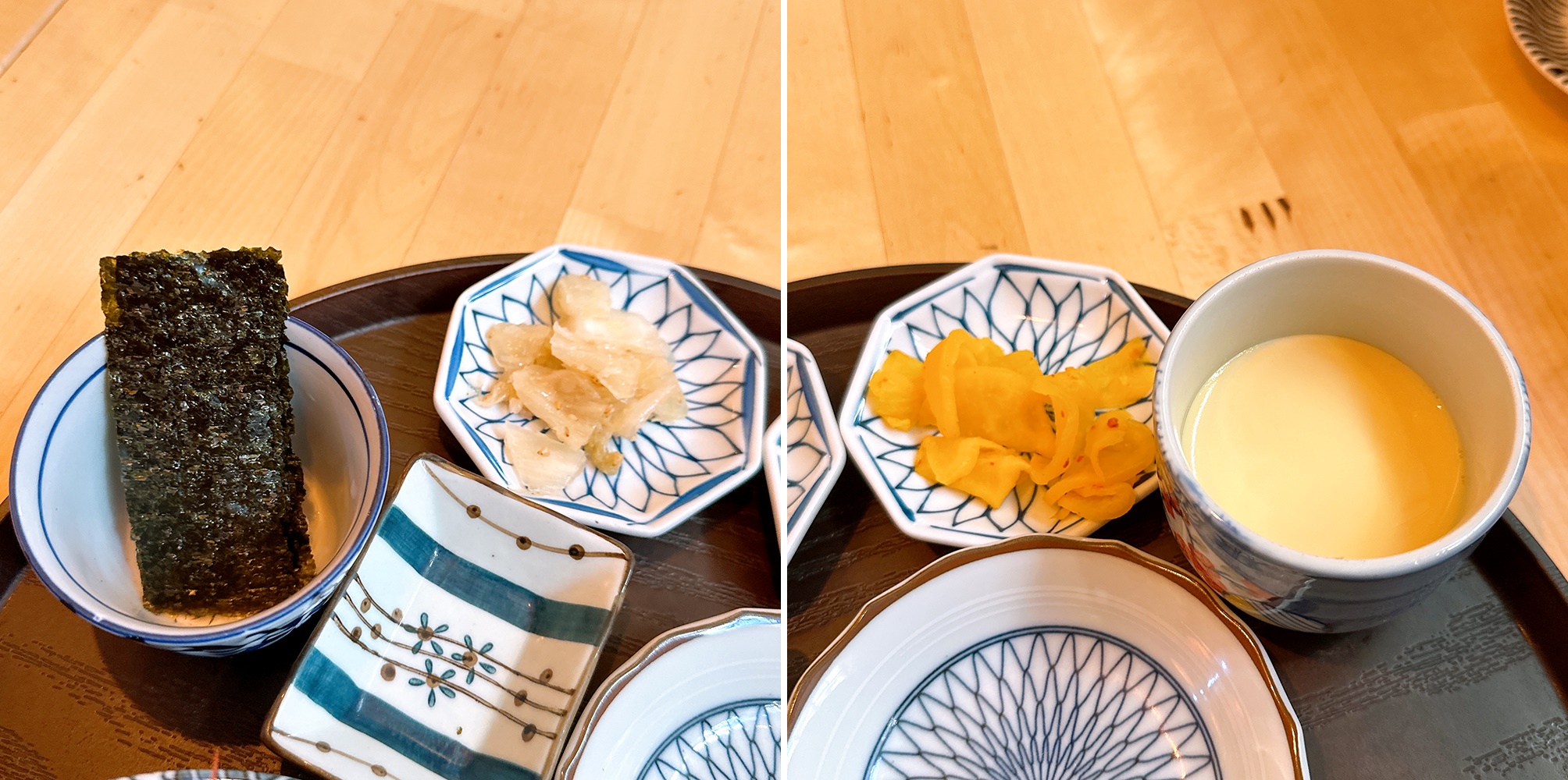 윗쪽으로 김이랑 장아찌랑 단무지무침, 계란찜 등이 준비되는데요- 이 김이 진짜 요물이에요! 회랑 싸먹으면 엄청 맛나답니다. 그래서 저희는 김을 3번정도 리필 받은 듯 하네요. 너무 맛있어서 계속 싸먹게 되더라구요~