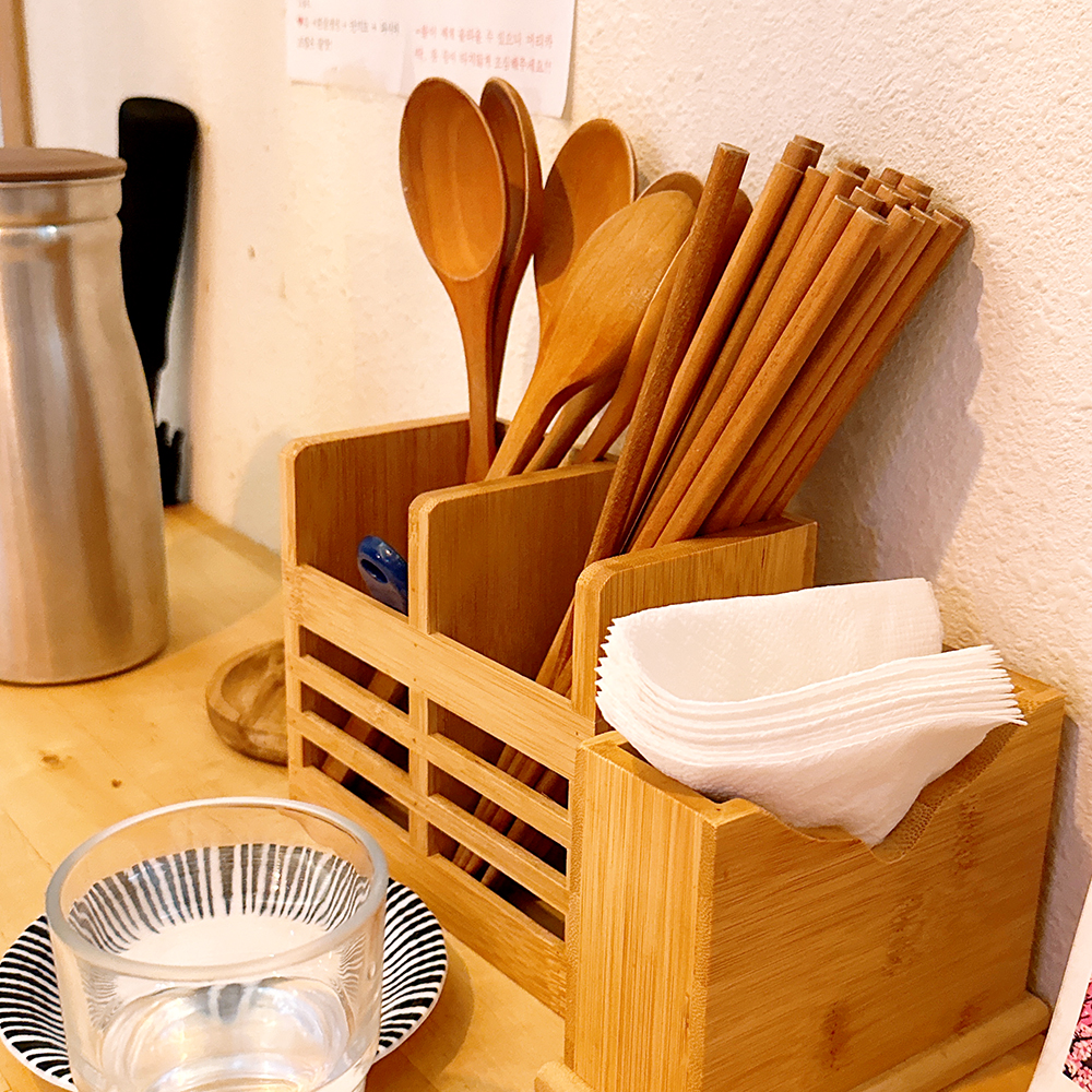 한켠에 숟가락과 젓가락이 세팅되어 있었습니다. 숟가락은 계란찜 떠먹을 때 참 야무지게 잘 먹었더랬죠! 이런 나무 수저까지 마음에 들었다는 건, 그냥 카이센동이 너무 맛있었기 때문이 아닐까..