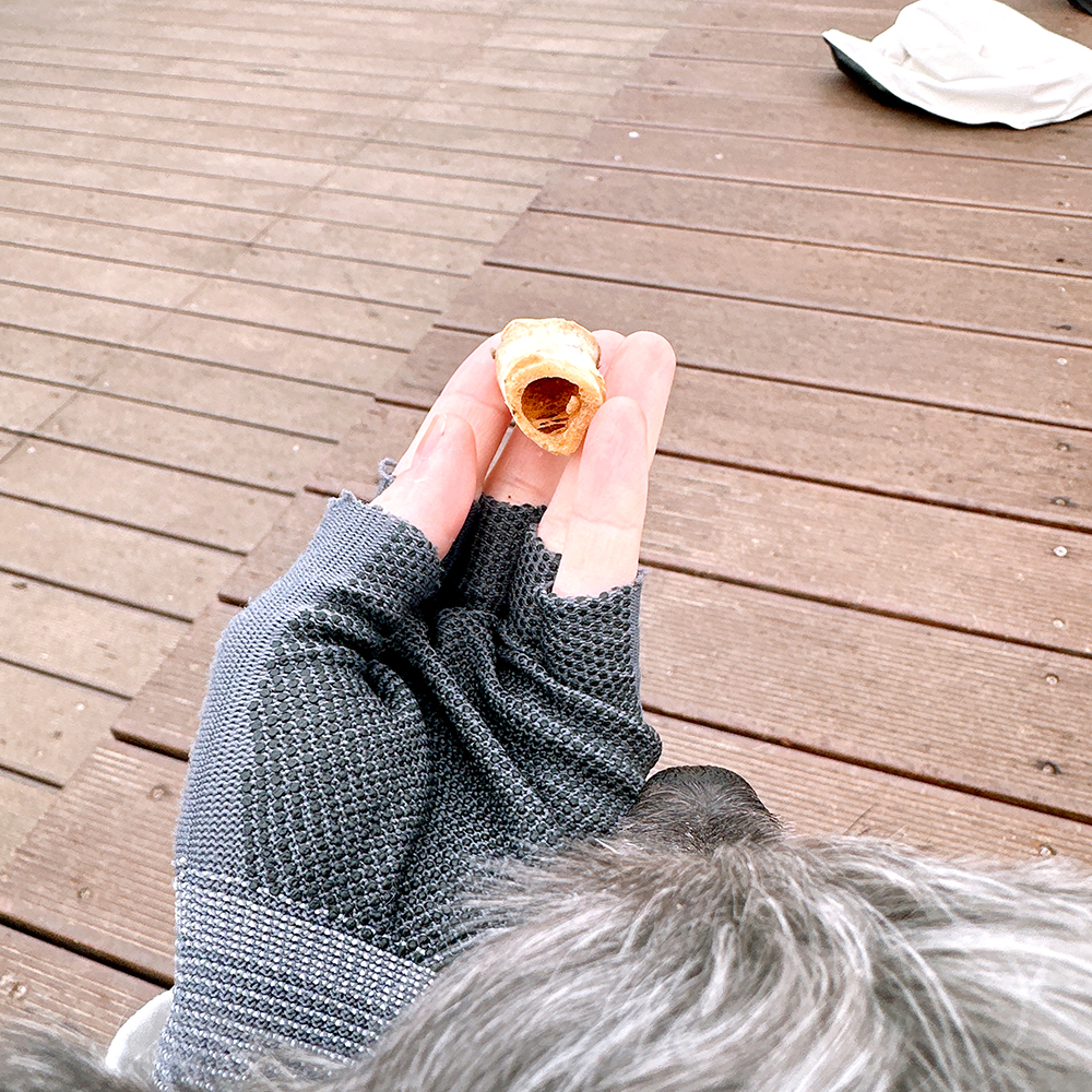 그리고.. 마마님과 함께 어플로 인증하는 동안, 밥이가 잠잠하더니 어디서 요런 뼈를 주워왔더라구요. 자기 나름 보물찾기 한 것 마냥 얼마나 해맑게 물고 오던지. 아마 등산하신 분들이 뭐 먹고 버린게 아닐까 싶은데.. 더러운거라고 냉큼 뺏들었죠. 미안하다 밥이야..