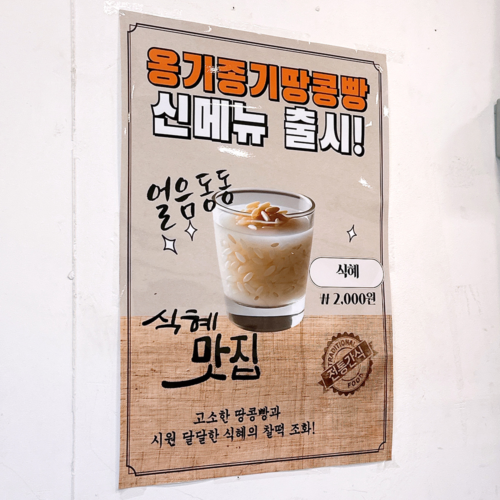 아, 그리고 요기는 기장 땅콩빵 외에도 식혜를 맛볼 수 있어요! 식혜는 2,000원 인데요- 얼음 동동 띄워져 있어서 시원하게 마셨답니다. 달큰한게 진짜 딱 제스타일이었어요~