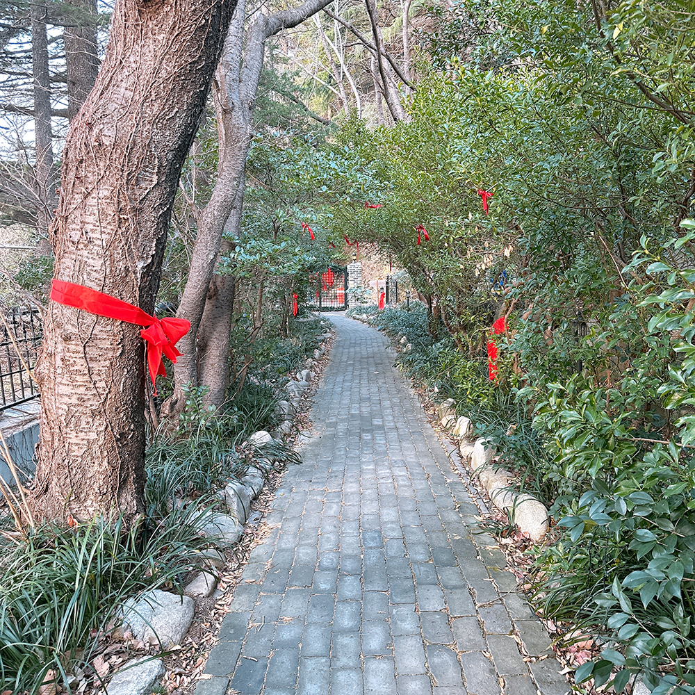 빨간 리본이 달린 대문을 지나 들어가면, 요로코롬 숲속을 걷는 듯한 느낌의 통로를 발견할 수 있어요. 정원도 참 잘 가꾸어 두셨더라구요~ 뭔가 언덕에 위치한 대궐 같은 카페라고 해야 할까요..? 숲속 오두막 느낌의 정겨움도 가지고 있고-