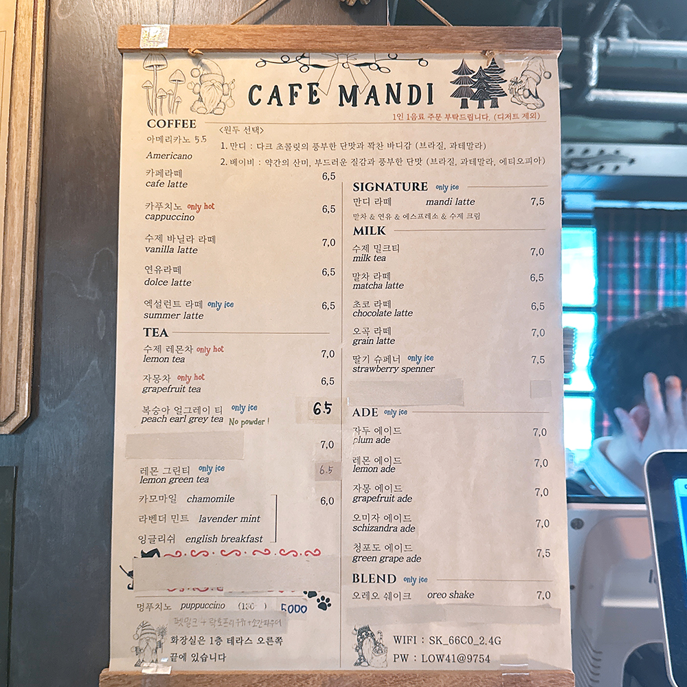 사진부터 정신없이 찍고 주문했습니다- 부산 크리스마스 트리 카페 만디 메뉴판인데요! 저희는 수제 밀크티(7,000원) + 아이스아메리카노(5,500원) + 초코생크림케이크(8,000원) 이렇게 주문했답니다-