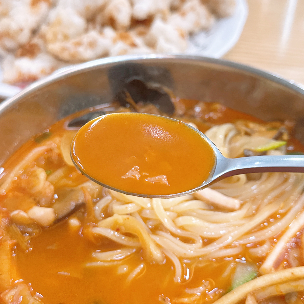 일단 국물 요리는 무조건 국물부터 먹어 봐야 한다는 입장이라, 한숟가락 호로록 떠먹어 봤는데요! 오우야.. 신라면 보다 맵지만 맛있었어요! 확실히 전문적으로 매운 요리를 하는 곳이라 그런가, 맛있게 맵더라구요.