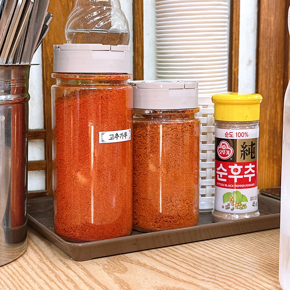 이 곳은 매운거에 진심인가봐요! 아까 짜장면도 맵다고 적혀 있던데- 고추가루 제대로 팍팍 뿌릴 수 있도록 한켠에 준비되어 있었어요. 기본적으로 매운데, 저기다가 고추가루 뿌리면 더 매울 것 같아서 눈으로 보기만.. 후후